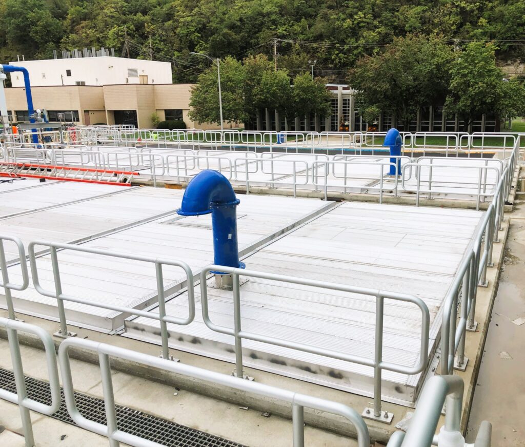 The Element 13 Aluminum Flat Panel Cover is a lightweight, low maintenance, clear-span cover that provides a sturdy walkable surface atop any basin. Our chemically resistant covers inhibit the emission of vapors, odors, and hazardous gases while preventing the ingress of rain, animals or other contaminants. These substantially sealed covers are designed in a such a way that they can be disassembled and reassembled from any point in the structure. This design promotes ease of access for maintenance and prolongs the lifespan of the structure.